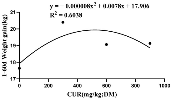 All experimental data were initially collated using Excel version 2007, and one-way ANOVA was performed by SPSS (version 22.2, IBM SPSS Statistics, NY, USA). When significant differences were observed, multiple comparisons were performed using Duncan’s test and linear and quadratic regression analysis. Dietary concentration of CUR represented the treatment effect. Individual lambs were regarded as experimental units. Linear and quadratic regression analysis were used to describe the treatment effect of CUR dose so as to more accurately determine the optimal dosage under the conditions of this study. In addition, total weight gain during 1 to 60 days through the nonlinear regression method came up with the optimum level of CUR. The data were expressed as means and pooled SEM. A significant level of p ≤ 0.05 was used.