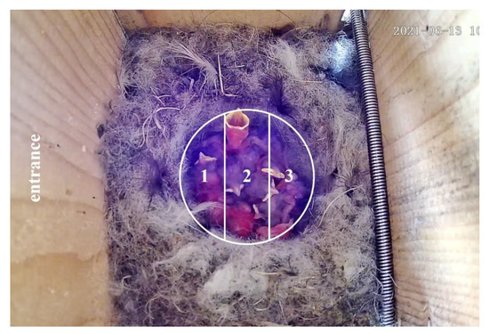 Analysis of the data was performed separately for nests that showed asynchronous hatching over two days (n = 8) and nests that showed asynchronous hatching over three days (n = 10). Day 0 was regarded as the day when all nestlings hatched; an analysis of the main food distribution time from day 1 to day 6, with recordings from 9:00 am to 12:00 am, was performed using a viewer (GOMPlayer, media player for Windows, GOM & Company, Seoul, Republic of Korea) which enables frame-by-frame inspection. The following factors were analyzed: (1) Hatching order according to asynchronous hatching; nestlings hatched on the same day received the same marking. Nestlings born on the first day were marked as 1, nestlings born on the second day were marked as 2, and nestlings born on the third day were marked as 3. (2) The age of each nestling by day, with day 0 designated as the day each nestling hatched. (3) Beak-open order, coded as 1 if the nestling who ate was the first among the siblings to open its beak when eating, or 0 otherwise. (4) Position of the nestling in relation to the entrance of the nest box (Figure 1) was coded as 1 when the nestling was fed close to the nest’s entrance, and as 3 when it was fed furthest from the entrance. (5) The date for determining the relationship between the start of breeding season and food supply. When the camera was covered by the bodies of the parents (15% of feeding occurrences), data that could not be used in determining which nestling was fed were excluded from statistical analysis.