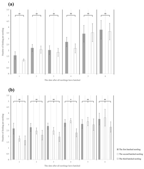 The results demonstrate that the difference in the average number of feedings per nestling according to the hatching order decreases with the passage of time from the day after all nestlings have hatched. A difference in the average number of feedings per nestling was observed between older nestlings and younger nestlings; we can presume that the reason for this is that the demand for food shows a gradual increase with increasing age of nestlings rather than selective distribution of food [36,37,38].