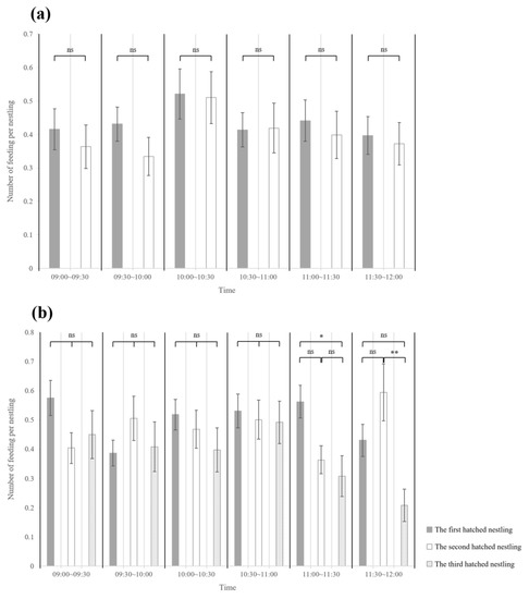 The average number of feedings per nestling during the period from 9:00 a.m. to 12:00 a.m., according to hatching order and time every 30 min, beginning at 9 a.m. (a) Nests that hatched over two days, (b) nests that hatched over three days. The black bar represents the first hatched nestling, the white bar represents the second hatched nestling, and the gray bar represents the third hatched nestling. (ns > 0.05, * p < 0.05, ** p < 0.01).
