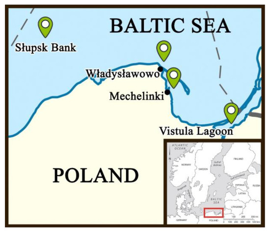 Map of the fish sampling sites along the central Polish coastline, namely, Mechelinki (54°37′07.0″ N 18°33′01.4″ E) (N = 50), Władysławowo (54°48′17.6″ N 18°24′33.1″ E) (N = 50), the Słupsk Bank (55°02′22.6″ N 16°22′03.0″ E) (N = 50), and the Vistula Lagoon (54°21′00.0″ N 19°33′00.0″ E) (N = 40).