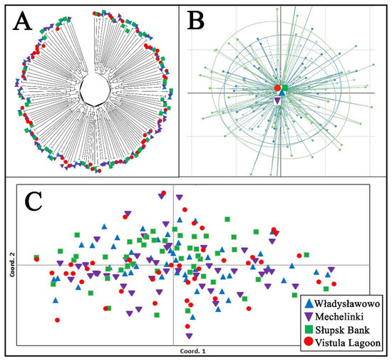 An analysis was conducted to identify an association between biological traits (i.e., sex, total body length, body mass, liver mass) and the pattern of genetic diversity (i.e., allele frequency, individual pairwise genetic distance, PIC, I, Ho, Fis) to assess the possible effect of selective pressure on the genetic structure of the studied fish. For this purpose, the recorded meristic parameters of the studied fish were transformed into relative values, i.e., Fulton’s condition factor (K) and the hepatosomatic index (HSI) [40,41]. Next, the sampled fish were divided into series of separate groups according to sex, the values of Fulton’s condition factor (K; (total weight × total lenght−3) × 100), and the hepatosomatic index (HSI; (liver weight × total weight−1) × 100) (Supplementary Table S3). All the abovementioned genetic parameters were then recalculated for each group. A non-parametric Kruskal–Wallis post hoc test analysis and a set of multidimensional analyses, such as principal components analysis (PCA/PCoA), correspondence analysis (DA), and discriminant function analysis (DFA), were implemented using Statistica (ver. 12.0) (StatSoft Company, Kraków, Poland) and GenAlEx software. These analyses were conducted to check for any significant (p < 0.05) associations in the estimated values of genetic parameters with any of the established fish groups as a sign of possible density-dependent genetic adaptation toward body condition indices. For PCoA analysis, individual pairwise genetic matrices for all analyzed fish were calculated, then each fish in the matrix was labeled according to the series group in their division. Lastly, a 2-dimensional plot was constructed. Because fish from the Vistula Lagoon displayed significant differences in terms of cohort composition, the analysis of correspondence between biological traits was carried out for all fish except for those sampled from the Vistula Lagoon.
