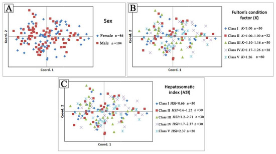 Principal coordinate analysis (PCoA) based on individual pairwise genetic distances between each predefined fish group based on (A) sex, (B) Fulton’s condition factor (K), and (C) Hepatosomatic index (HSI) values.