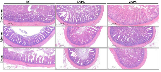 As shown in Figure 2 and Table 8, the ZNPS group showed elevated duodenum and ileum VH when compared with the NC group (p < 0.01). At the same time, the VH in the ZNPS group was higher than that in the NC group (p < 0.05). Moreover, the VH of the jejunum of the ZNPL group was higher than that of NC or ZNPS (p < 0.05). Moreover, the duodenum and ileum CD of the ZNPS group was higher than that of ZNPL (p < 0.01), and the VH/CD of the duodenum, jejunum, and ilenum of ZNPL and ZNPS were higher than that of NC (p < 0.01). At the same time, the duodenum and jejunum VH/CD were higher in the ZNPS group than in the ZNPL group (p < 0.01).