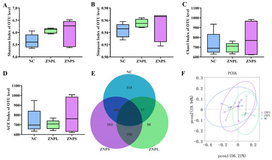 Bacterial alpha diversity indices for the three groups are shown in Figure 3. There was no significant difference in Shannon and Simpson at OTU level among the three groups. Moreover, there was no significant difference in Chao1 and ACE in OTU (Figure 3C,D). Venn analysis showed that the OTU numbers in the NC, ZNPL, and ZNPS groups were 1079, 976, and 1227, respectively (Figure 3E). Additionally, as shown in Figure 3F, there was no obvious clustering of the samples into the three groups. These results suggest that nano-ZnO does not affect the microbiota of the chicken cecum (Figure 3F).