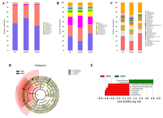 The gut flora of these three groups was mainly composed of Firmicutes and Bacteroidetes (Figure 4A). On the phylum level, the abundance of Bacteroidetes in the ZNPL group decreased significantly compared with the ZNPS group (Figure 5B). However, the ratio of Firmicutes/Bacteroidetes was higher in the ZNPL than in the NC and ZNPS (p < 0.05 and p < 0.01, respectively) (Figure 5C). On the family level, the proportion of Bacteroideae in the ZNPS group was higher than that of the ZNPL (p < 0.01; Figure 5D). Moreover, the highest proportion of Lachnospiraceae and Erysipelotrichaceae was found in the ZNPL group (p < 0.05, p < 0.01; Figure 5E,F).