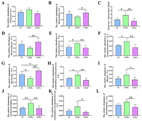 As shown in Figure 4D,E, LDA scores of four or greater were confirmed by LEfSe. On the genus level, the number of unidentified_Lachnospiraceae in the ZNPL group was increased, and the linear discriminant analysis showed that the relative abundance of Bacteroides was elevated in ZNPS. Besides, the ZNPS group possessed significantly higher levels of Bacteroides than that in the NC and ZNPL groups (p < 0.05, p < 0.01; Figure 5G). ZNPL significantly increased the relative abundances of unidentified_Lachnospiraceae and Lachnoclostridium compared with those in the NC group (Figure 5H,J). Compared with the ZNPS group, the abundance of unidentified_Lachnospiraceae, Blautia, Lachnoclostridium, unidentified_Erysipelotrichaceae, and Intestinimonas was significantly increased in the ZNPL group (Figure 5H–L).