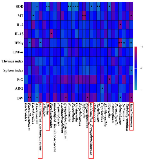 Predictive analysis of intestinal microbiota phenotypes in broilers. Heatmap of Spearman’s correlation between gut microbial composition (relative abundance of genera) and indexes related to BW, ADG, F:G, spleen index, thymus index, TNF-α, IFN-γ, IL-1β, IL-2, MT, and SOD in broilers. * is significantly different (p < 0.05). ** are significantly different (p < 0.01); The red boxes represent significant differences in the relative abundance of the bacteria between the three groups; The colors range from nattier blue (positive correlation) to red (negative correlation).