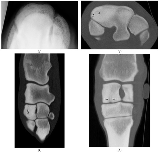 - Crijins, C.P.; Martens, A.; Bergman, H.-J.; van der Veen, H.; Duchateau, L.; van Bree, H.J.J.; Gielen, I.M.V.L. Intramodality and intermodality agreement in radiography and computed tomography of equine distal limb fractures. Equine Vet. J. 2014, 46, 92–96. [Google Scholar] [CrossRef] [PubMed]
