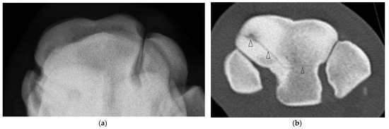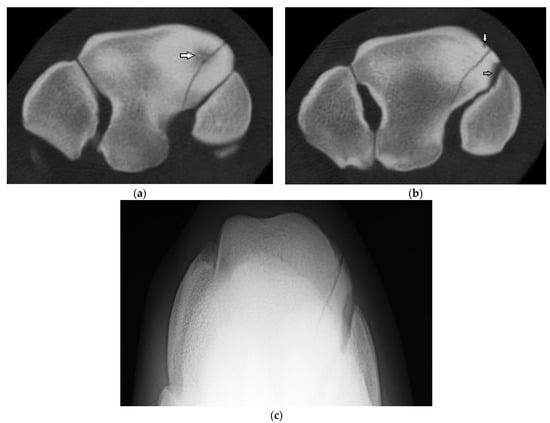 - Morgan, J.W.; Santschi, E.M.; Zekas, L.J.; Scollay-Ward, M.C.; Markel, M.D.; Radtke, C.L.; Sample, S.J.; Keuler, N.S.; Muir, P. Comparison of radiography and computed tomography to evaluate metacarpo/metatarsophalangeal joint pathology of paired limbs of Thoroughbred racehorses with severe condylar fracture. Vet. Surg. 2006, 35, 611–617. [Google Scholar] [CrossRef] [PubMed]