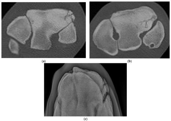 - Cianci, J.M.; Wulster, K.B.; Richardson, D.W. Computed tomography assessment of fracture characteristics and subchondral bone injury in Thoroughbred racehorses with lateral condylar fractures and their relationship to outcome. Vet. Surg. 2022, 51, 426–437. [Google Scholar] [CrossRef] [PubMed]