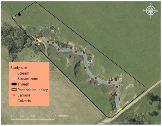 The study was conducted in a permanently fenced 1.7 ha paddock with the dimensions of 249.0 m × 249.4 m × 85.0 m × 50.2 m (Figure 1) that contained a discrete natural stream. The stream was classified as sixth-order based on high resolution 1 m LiDAR digital elevation data [37]. The stream was 233 m in length, <1 m wide, and <30 cm deep in base flow conditions (Figure 1). The stream contained culverts at the entrance and exit of the paddock. The watershed area supplying the study paddock between the inflow and outflow was calculated by ArcGIS Pro to be 4.1 ha (Figure 2, watershed 2).