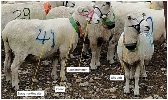 A photo of sheep with spray marks wearing accelerometers, GPS, and collars.