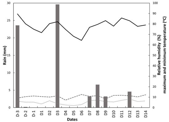 Weather data were retrieved from three days prior to the start of the study (D-1 to D-3) to the completion of the study period (Figure 4). Rainfall occurred on 7 days of the 16-day study period, with rainfall volumes ranging from 0.2 to 27 mm/day. Maximum daily temperatures ranged from 7.2 to 13.1 °C, and the minimum daily temperature ranged from 1.7 to 8.4 °C. Relative humidity ranged from 64% to 90%.