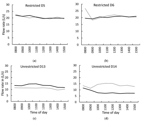 Hourly mean stream flowrate (L/s) at the inflow (grey line) and outflow (black line) monitoring sites by time of day (0800 to 1500 h) during the period of restricted access to water trough on D5 and D6 ((a,b) in upper panels) and the period of non-restricted access on D13 and D14 ((c,d) in lower panels).