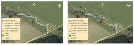 During the period of water trough restriction, there were two significant hot spots (statistically significant spatial clustering of locations) identified within the paddock (p < 0.05; Figure 8A). When the trough was unrestricted, eight smaller areas were detected (Figure 8B). When the stream zone was analysed independently of the rest of the paddock, six cold spots and five hot spots were identified during the unrestricted trough access period (p < 0.05; Figure 8D), whereas in the restricted period, the stream zone showed only hot spot areas around each culvert (Figure 8C).