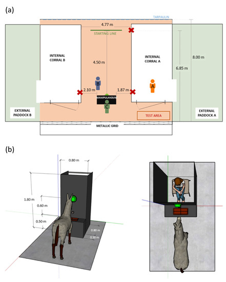 The test area was structured as depicted in Figure 1a, with a manipulandum located at the end of the corridor. The manipulandum was an apparatus specifically designed and comprised a cabin with a green button on the front side (Figure 1b). Researcher C provided the positive reinforcement or the negative stimulus from inside the cabin as soon as the donkey pressed the button. In order to obtain the reinforcement, the pressure had to be ‘complete’, with the button lighting up and making a sound automatically. The ‘not complete’ pressures, i.e., the ones that did not make the buzzer light up and ring, were noted as ‘attempts’ of pressure and did not provide any reward to the animal.