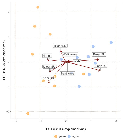 Facial expressions, postures, and movements (calculated as the percentage duration of each behavioural manifestation for each subject) were analysed using principal component analysis (PCA). The latter is an exploratory technique that increases data interpretability, transforming high-dimension data into lower-dimension data while retaining as much information as possible [53]. The aim of the PCA was to provide an overview of potential facial expressions, postures, and movements significantly associated with each test group (i.e., positive and negative). The different facial expressions and postures were included in the analysis as behavioural variables of interest and the two test groups as illustrative variables to assess the association between the manifestation of certain behaviours in the context of the administration of a rewarding stimulus ((+) test) or, conversely, an unexpected and frustrating stimulus ((−) test). The Wilcoxon signed-rank test was applied to evaluate significant differences in the subjects’ scores obtained for the first three principal components (PCs), to determine the ones most associated with the subjects’ grouping defined by the test type. Once identified, the Spearman correlation coefficients were calculated between the significant PCs and the list of behaviours included in the analysis, to classify the groups of modes mostly manifested by the animals in the two different contexts.