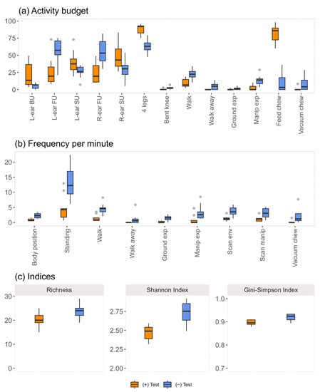 Graphical representation of each behaviour/behavioural modes distributions calculated for the following behavioural diversity indices: (a) activity budget (percentage of time spent by subjects in manifesting each behaviour); (b) frequency per minute (number of events per minute): the possible variants of some behaviours (i.e., body position, standing, ground exploration) have been grouped and considered together, following what is reported in Table 3; (c) richness (count of the different behavioural modes); Shannon index (behavioural richness and evenness); Gini-Simpson index (probability that two behaviours randomly selected from a sample will be different). Only significant comparisons are shown (p < 0.05), for the complete list of behaviours see Supplementary Table S1.