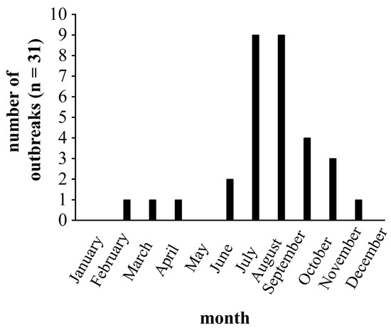 Seasonal distribution of analysed histomonosis outbreaks on 31 farms since January 2018.