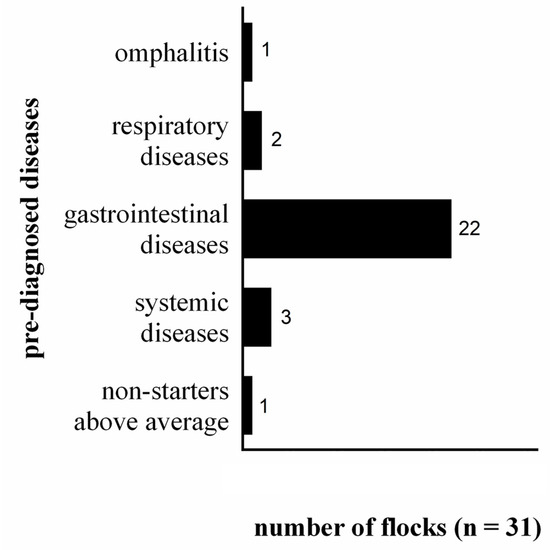 Pre-existing diseases were diagnosed in 23 flocks (Figure 3). It was noticeable that over 70% of the affected flocks were diagnosed before the onset of a histomonosis outbreak with gastrointestinal diseases, associated with the detection of Escherichia coli, Eimeria species (spp.), or Clostridium spp. (Table 3). Accordingly, almost all flocks were pre-treated with antibiotics (24/31; Table S3a). The abovementioned microbes seem to favour H. meleagridis-related clinical symptoms or vice versa [18,45,46,47,48,49]. In addition, the antibiotic treatment could lead to imbalances in the gastrointestinal tract, possibly resulting in an accumulation of microbes that favour H. meleagridis [50].