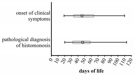 Comparison of the range of onset of clinical symptoms and the range of the pathological diagnosis of histomonosis, o = mean, ☐ = 25%- to 75%-quantile.