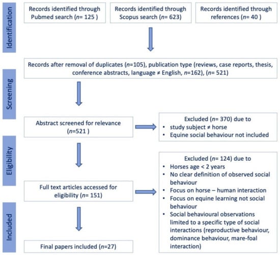 A total of 125 articles were identified in PubMed, 623 additional papers in Scopus and another 40 based on references, yielding a total of 788 articles (Figure 1). After removing duplicates, reviews, commentaries, single case reports, books and non-English or German articles, 521 papers remained. Following the exclusion of papers that did not focus on adult (≥2 years) equine intraspecific social behaviour but on interspecies interaction or other behavioural observations or did not provide a well-defined ethogram of the observed behaviours, 27 articles remained and were included in the qualitative synthesis [5,12,13,14,22,26,27,29,30,34,37,41,52,54,55,56,58,62,79,80,88,89,90,91,92,93,94].