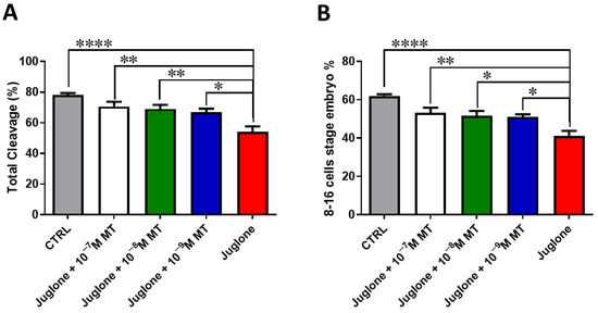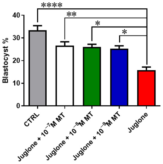 Juglone is the polyphenolic extract of walnut trees (Juglans), and it was considered an anti-inflammatory, immunoregulatory, antimicrobial, and anticancer agent [16]. In the context of embryo development, the effects of juglone during embryo development has been previously studied by us in an earlier investigation [19], however in ART, the potential interaction between MT and juglone has not yet been investigated. We observed that exposure of oocytes to MT at different concentrations ranging from 10−7, 10−8 to 10−9 M while under the stress of 20 µM juglone exposure significantly restored the developmental competence which was restricted in the sole juglone treatment. While the 10−7 M dose was the most effective in the improvement of all developmental processes. In line with our previous results, MT at the same concentration was reported to alleviate the toxicity of the dietary supplement nicotinamide when treated at high concentration during oocyte maturation [11]. Moreover, under the stress of mycotoxins (β-zearalenol and HT-2), MT has been reported to alleviated the toxicity of these compounds in bovine ovarian granulosa cells [12]. Additionally, the deleterious effects of bisphenol A, aflatoxin B1, and paraquat herbicide have been attenuated upon the treatment of MT during oocyte maturation [24,25,26].