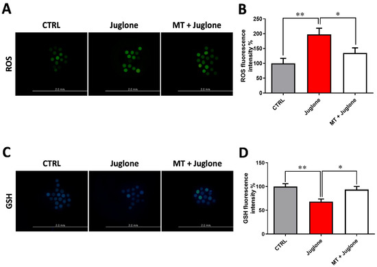 Due to the observed protective effects of melatonin being achieved in the combination group of melatonin 10−7 M and juglone 20 µM, all the subsequent experiments, in addition to the sole juglone 20 µM and control groups, were conducted using this combination group. To scrutinize the oxidative stress in oocytes, the GSH content and ROS levels were determined using ThiolTracker Violet and H2DCFDA staining, respectively. Fluorescence intensity of ROS and GSH was correspondingly increased and decreased in juglone-treated oocytes compared to melatonin-juglone co-treated and untreated groups that showed the opposite profiles (Figure 3A–D).
