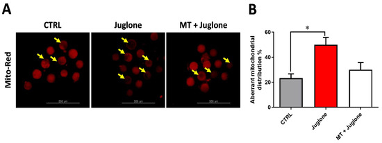 Furthermore, the impact of juglone and melatonin administration during IVM on mitochondrial distribution pattern was inspected using the MitoTracker Deep Red. We found a significant increase in the mitochondrial aberrant pattern in juglone treatment, while a lower incidence was detected in the other experimental groups (Figure 4A,B).