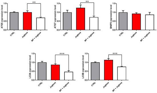 Autophagy is the process by which the cell can control apoptosis and removes the damaged substances and abnormal proteins in its cytoplasm. During IVM, the hyperactivation of autophagy was reported to have a negative impact on oocyte quality, the similar effects that are caused by the induction of apoptosis in oocyte [11,20]. We and others previously displayed the induction of both apoptosis and autophagy by juglone via the interaction with the different cellular signaling pathways such as the PI3K/AKT/mTOR in bovine oocytes and the MAPK pathway in hepatocellular carcinoma [18,30]. Interestingly, the administration of MT during IVM and in the presence of different toxic compounds was confirmed to have a great impact on the downregulation of the levels of both apoptosis and autophagy in bovine oocytes [10,11]. In the current study, we demonstrated the efficiency of MT to diminish the expression of various genes related to autophagy under the stress of juglone-induced autophagy in oocytes, and these results confirm the previously mentioned investigations in this concern. Moreover, it affirms the earlier studies on the interfering impact of both apoptosis and autophagy on the developmental competence of bovine oocyte and mitochondrial health [20,31]. These data also confirm our abovementioned finding of the decrease in developmental competence and homogenous distribution pattern of mitochondria during juglone treatment, effects which were suppressed in the MT-Juglone co-treatment experiment