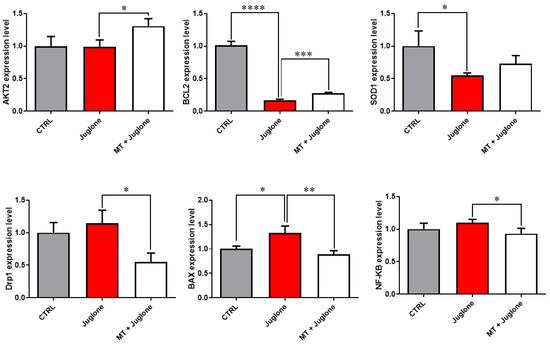 Moreover, checking the mRNA expression levels of various markers involved in the regulation of autophagy in matured oocytes revealed a significant upregulation of the mRNA levels of the ATG5, ATG7, LC3A, and LC3B markers in the juglone-treated compared to the co-treatment group (Figure 5). In addition, as seen in Figure 6, the molecular characterization of oxidative-stress-related genes displayed a sharp decrease in mRNA levels of the anti-apoptotic gene BCL2, and melatonin significantly restored the expression levels. Low expression patterns in the levels of the mitochondrial fission Drp1, and oxidative-stress-related genes BAX and NF-KB were observed in melatonin–juglone dual treatment group compared to the sole juglone-exposed oocytes, while the expression of the mitochondrial AKT2 gene was upregulated in the co-treated melatonin and juglone oocytes.
