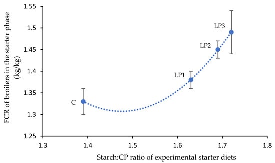Quadratic relationship (R2 = 0.9998; p = 0.014) between calculated dietary starch:CP ratio and the mean FCR of animals in the starter phase (mean ± SE; n = 6 per treatment) where y = 3.074x2 − 9.071x + 8.001. C—control diet; LP1—reduced crude protein levels (−1.5%) and isocaloric AMEn content compared to the control diet; LP2—reduced crude protein (−1.5%) and AMEn levels (−1.5%) compared to the control diet; LP3—reduced crude protein (−1.5%) and AMEn levels (−3%) compared to the control diet.