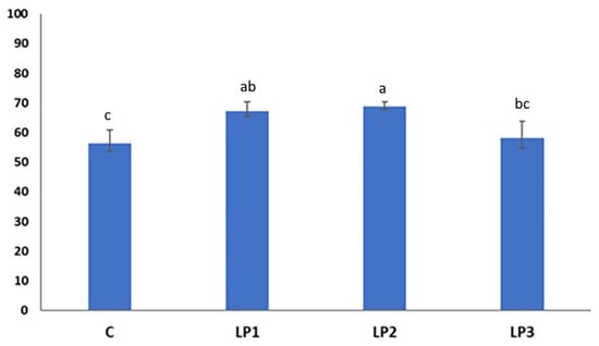The broilers of treatment LP2 achieved the highest N retention, which proved to be significantly higher than the values in the dietary groups C and LP3 (p < 0.05; Figure 2). Furthermore, treatment LP1 also resulted in significantly higher N retention than the control treatment. No significant difference was observed between the N retention values of broilers receiving treatments C and LP3 (p > 0.05).