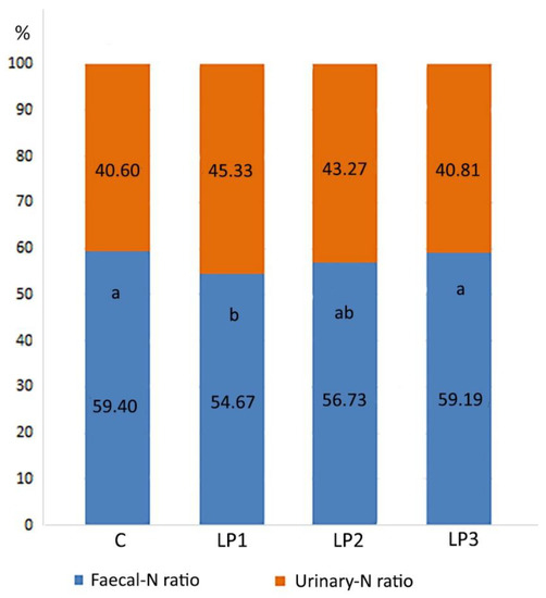 The ratio of urinary-N and fecal-N content in excreta followed a similar pattern as in the case of the previously described N forms (Figure 3). Treatment LP1 showed a significantly lower fecal-N ratio compared to treatments C and LP3 (p < 0.05). In the case of treatment LP2, no further significant changes were observed.