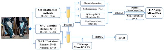The use of animals and experiments were in agreement with the Animal Experimentation Ethics Committee at Beijing Jiaotong University, Beijing, China (Code ID: SS-QX-2014-06). A total of 3 animal groups were selected: set 1: 6 healthy Holstein cows for the cfDNA extraction methods; set 2: 18 healthy and 18 clinical mastitis Holstein cows for the relationship between mastitis and cfDNA level; set 3: 18 healthy in summer as the heat stress group (July, THI > 78) and 18 in autumn as the thermo-neutral group (November, 45.5 < THI < 68). The THI was measured using an automatic weather station (Model: P4581, Comet System S.R.O., Bezrucova, Czech Republic) located within the lactating cows’ pen. These animals were raised at the Sanyuan dairy farm in Beijing, China. The cows were kept under basic managerial practices, fed three times a day in a scattered hurdle with a full mixed ration, and had full access to fresh drinking water. The experimental cows were housed in a semi-open barn with sprinklers above the feeding line and fans above the stall. In summer, cooling sessions were held during feeding times. Free-stall fans and sprinklers were operational during the hottest period in the area. Cows were allowed to rest in the barn-free yard outside at night, depending on the weather. The animals with clinical mastitis were diagnosed by a veterinarian, and the samples were directly obtained from the farm. According to the diagnosis history, the cows showed clear signs of swelling and inflammation of the udder, fever, reduced feed intake, and the animal avoided lying to reduce pressure on the udder.