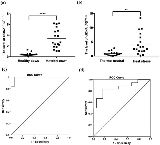 The effect of mastitis and heat stress on the cfDNA levels in cows. (a,b): Levels of cfDNA determined by 18SrRNA genes; (a): healthy and mastitis cows (**** p < 0.0001); (b): cows in heat stress and thermo-neutral (** p < 0.01). (c,d): ROC curve of cfDNA; (c): healthy and mastitis cows (AUC = 0.99); (d): cows in heat stress and thermo-neutral (AUC = 0.86).