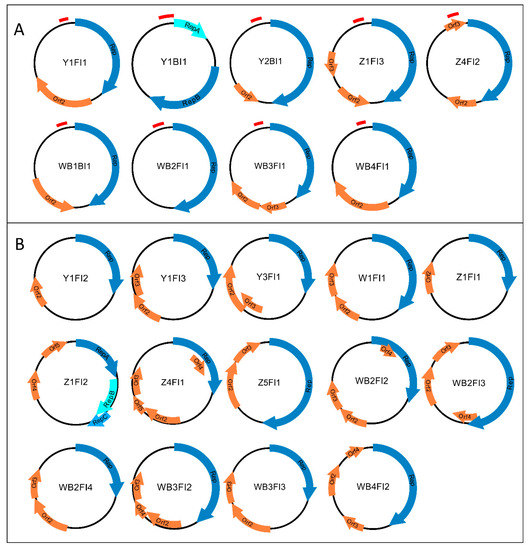 Schematic illustration of 23 BMMF molecules identified in this study. The arrows in different shades of blue represent potential rep-genes. Orange arrows indicate uncharacterized ORFs. All elements belonging to the BMMF group 1 (A) additionally feature a tandem repeat region upstream of the rep-gene that is illustrated by a red bar. Molecules belonging to the BMMF group 2 (B) lack this specific attribute.