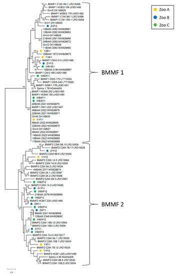 Other studies focusing on circular ssDNA viruses (e.g., Anelloviridae and Circoviridae) in farm animals have reported a much higher prevalence compared to our results [65,66]. This discrepancy might be attributed to some limitations in this study, such as the sample size and the use of targeted primers. Therefore, the frequency and diversity of circular DNA viruses and BMMF could potentially be higher than shown here. The application of alternative and supportive methods like Next Generation Sequencing could provide clarification in this respect.
