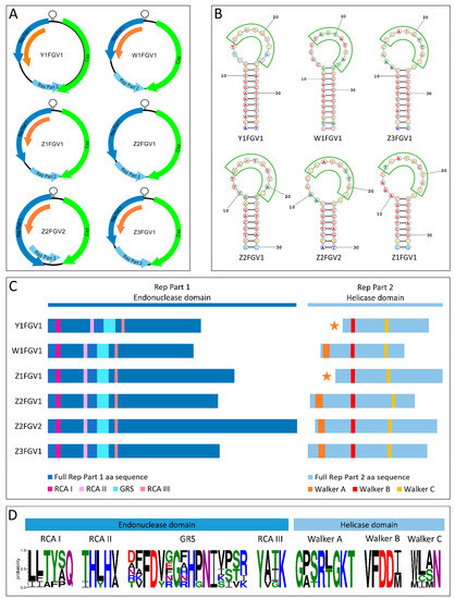 In-depth characterization of genomovirus sequences. (A) Genomic organization of six genomovirus sequences. Dark blue arrows represent the first part (Rep Part 1) of a potential rep-gene, while light blue arrows show the second part (Rep Part 2). Cap-genes are illustrated by green and further hypothetical ORFs by orange arrows. (B) Predicted stem-loop structure of each genomovirus, including the nonanucleotide motif that is highlighted by a green border (https://rna.urmc.rochester.edu/ accessed on 10 March 2023). (C) Illustration of the rep-gene organization with conserved endonuclease and helicase amino acid motifs. ORFs named ‘Rep Part 1’ contained the RCA motifs I, II, III and the GRS domain. Except for isolates Y1FGV1 and Z1FGV1, ‘Rep Part 2’ exhibited the motifs Walker A, B and C. In the two exceptions, the Walker A motif was located in the non-coding region between ‘Rep Part 1’ and ‘Rep Part 2’, indicated by the orange star. (D) Depiction of the variation within the amino acid motifs present in the six genomoviruses using WebLogo 3.7.12 (https://weblogo.threeplusone.com/create.cgi accessed on 10 March 2023). Colors indicate chemical properties of the different residues (black: hydrophobic; green: polar; purple: neutral; blue: basic; red: acidic).