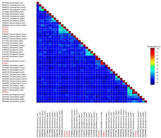 Genome-wide pairwise nucleotide similarity score matrix, including six full-length genomoviruses from this study and ICTV-listed representatives of the family Genomoviridae (except for the genus Gemytripvirus). Sequences from this study are written in red letters.