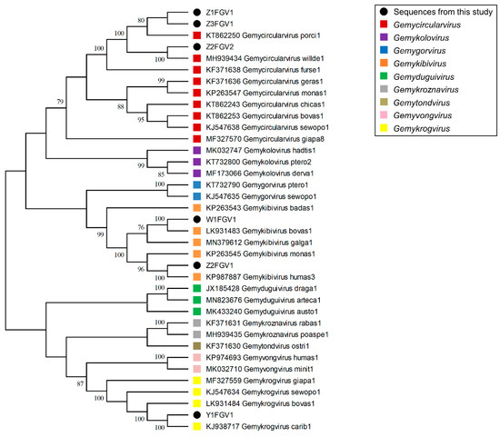 Maximum Likelihood phylogenetic tree of the six identified genomoviruses and representatives of the genomovirus genera (except for the genus Gemytripvirus). The evolutionary history was inferred by using the Maximum Likelihood method and the Tamura-Nei model [49]. The bootstrap consensus tree is based on 500 replicates. The percentage of trees in which the associated taxa clustered together is shown next to the branches. Branch support values lower than 70% were not included. Black dots highlight all sequences detected in this study. The colored squares indicate the different genomovirus genera. Evolutionary analyses were conducted by MEGA X [50].