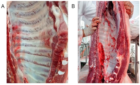 Observation of severe pleurisy lesions in pig carcasses. (A): pleurisy lesion scores 3; presence of marked inflammation in the chest cavity. (B): pleurisy lesion scores 4; evident presence of fibrin and adherence of lung lobes to the chest cavity of carcass.