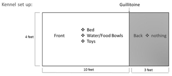 Kennels were arranged in two rows of 10 with a walkway between the rows and walkways bracketing the outside of the kennels. They had a ‘front’ portion 10 × 4 feet with four feet high walls. The front was separated from the ‘back’ portion by a solid upper wall and a lower metal sheet that could rise and fall to lock the dog on either side. The back portion was 3 × 4 feet with four feet high walls. All kennels had blankets (some also have a raised plastic bed), a food bowl, a water bowl, and at least one toy in the front portion. No items were in the back portion, and studies have shown that a basic setting is not physically or mentally arousing [36]. The dogs were kept in the front during the day with the metal sheet down and limited or no access to the back portion of the kennel except during cleaning. Dogs were observed at a roughly 45-degree angle from the kennel against the wall (3-foot clearance) in their shelter-assigned kennel and not moved for this study. Researchers were standing and facing the dogs to be able to record vocalization as it occurred (ensuring the vocalization was from the dog under observation and not a neighbor). Figure 1 shows a summary of a standard kennel under observation.