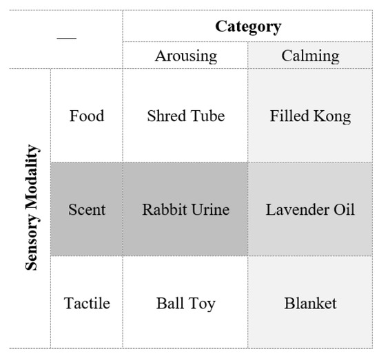 Beyond the kind of enrichment items mentioned above, enrichment that can target different sensory systems may also change the behavior of animals in different ways. Food enrichment (i.e., anything that involves access to food, such as puzzle boxes) is found in almost half of all studies with zoo animals [27]. Scent enrichment is one of the newest forms of enrichment for all animals [18,30], with most of the work done with cats and felids [29]. Certain scent items have been found to have a calming effect on dogs [29]. For example, lavender has been shown to encourage calm behaviors and decrease vocalization frequency during the acute stress of care rides [34,37,38]. In contrast, few studies have examined arousing scents. Prey urine was also found to increase overall activity levels, suggesting that arousing scent enrichment also influences behavior [38]. Overall, the effect of different scents on canid behavior is not well studied [39] and therefore requires more investigation to better our understanding. Tactile enrichment, such as blankets or toys, is one of the most common forms of enrichment used in shelters; however, despite its prevalence, it has not been well studied [29]. Previous studies have suggested looking more specifically at the type of toy (i.e., hanging versus laying on the floor) presented to dogs [40] instead of treating all toys equally enticing. This suggestion is important because toys that the dog ignores illicit no interaction and therefore are not effective enrichment items. Although different types of enrichments could engage different sensory modalities, they have not been compared in a single study to determine their effectiveness as a stress buffer during morning cleaning.