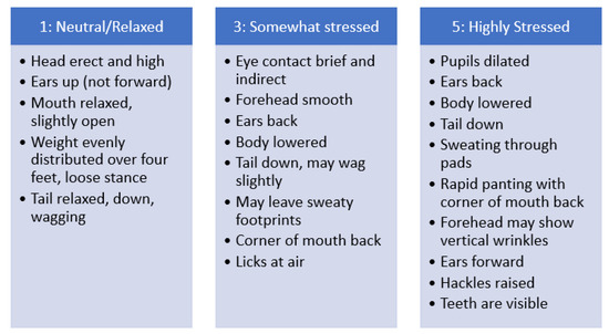 There are different measurements that researchers can use to try to evaluate the welfare of their animal subjects. Behavior measurements are used because they are cost-effective and have been used in numerous studies to determine the animal’s welfare state in question [12]. Observing the animal’s behavior may be one of the best indications of preference or aversion [13]. It can indicate different emotional states [14]. Shelter staff can then use picture representations of correlated behaviors to determine the animal’s overall stress level. These representations often include overall ‘body position’, body language, and other validated stress behaviors, which can be used to assign a stress score or value [15]. For example, common behavioral indicators of poor canine welfare include frequent vocalizations, crouching (i.e., heads below the chest line), flattened ears, or a lowered tail [2,15,16,17,18].