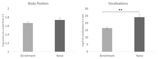 Comparison of the means of body position and vocalization frequency for enrichment presence to no enrichment. The presence of enrichment significantly affected vocalization frequency, such that dogs vocalized less on average when given enrichment. Asterisks denote significance below the p < 0.01 level. Error bars show ± one standard error.
