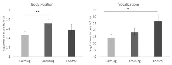 The second aim of this study was to determine if one of the proposed categories of enrichment (calming vs. arousing enrichment) is more effective at reducing negative, stress-induced behaviors. For this aim, we hypothesized that calming enrichment would lower vocalization frequency and body position score compared to arousing enrichment.
