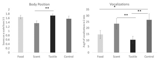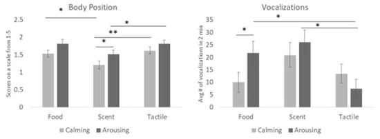 The figure illustrates the interaction between category and sensory modality. Calming scent items were associated with the lowest body position score (i.e., more relaxed) compared to the other enrichment conditions. Calming food had significantly lower vocalization frequency on average than arousing food. Arousing tactile items reduced vocalizations more than other arousing conditions. One asterisk denotes significance below the p < 0.05 level. Two asterisks denote significance below the p < 0.01 level. Error bars show ± one standard error.