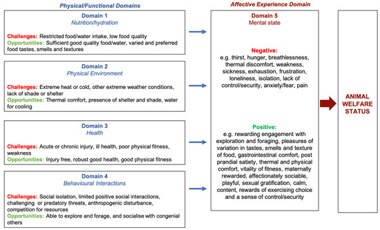 Contemporary animal welfare science aims to interpret indicators of biological function and behaviour in terms of the mental experiences that those indicators are likely to reflect [1,2,3]. The Five Domains Model for assessing welfare status has been described in detail [2,3,4,5,6,7] and is illustrated again here (Figure 1). It structurally represents the understanding that physical and mental states are linked and facilitates the assessment of welfare based on our current understanding of the functional bases of negative and positive subjective experiences that animals may have. Following measurement of indicators within each physical/functional Domain, anticipated negative or positive affective consequences are cautiously inferred and assigned to Domain 5. It is these mental experiences that contribute to descriptions of the animal’s welfare state [1,2,3].